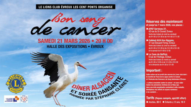 Tous les bénéfices seront remis au Comité de l’Eure de la Ligue contre le Cancer et à l’Amicale des Donneurs de Sang bénévoles d’Évreux.